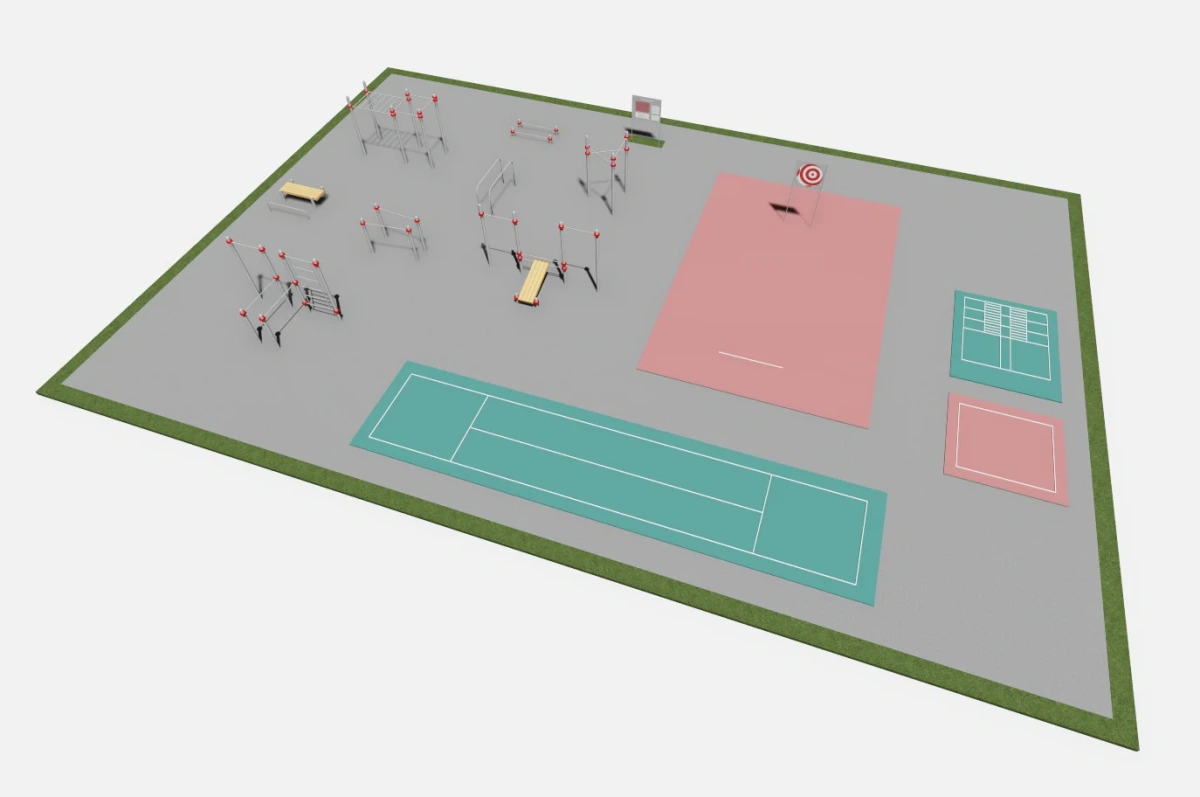 Спортивная площадка включает тренажеры: СК018, Б011, Б010, Б008, Б006, РК032, Б004, Т007, СК017, Т011.
