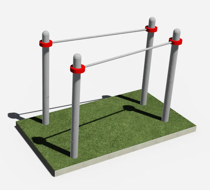Опорные столбы высотой 1500мм в количестве 4 единиц, диаметр которых предоставляется на выбор, 2 горизонтальные перекладины длиной 1700 мм, расположенная на высоте 1300 мм от поверхности основания. Перекладина крепится к опорным столбам при помощи хомутов. Длина комплекса не более 2000 мм.