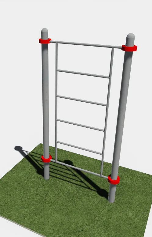 Составляющей шведской стенки являются шесть перекладин, расстояние между которыми 370 мм. Ширина шведской стенки 1200 мм, высота 2000 мм. Шведская стенка крепится к опорным столбам высотой 2600 мм при помощи хомутов на высоте 2450 мм. Длина комплекса составляет не более 1450 мм.