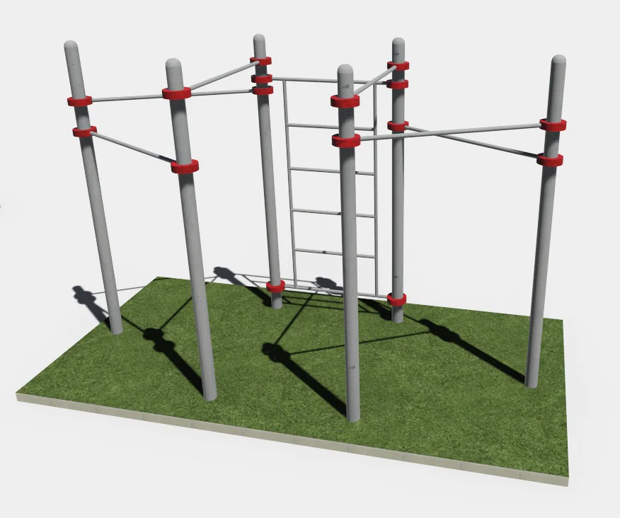 К опорным столбам высотой 2600мм в количестве 6 единиц крепится на высоте от уровня основания 2300 мм шведская стенка, на высоте 2450 мм, 2100 мм, 1900 мм -перекладины турника-треугольника.