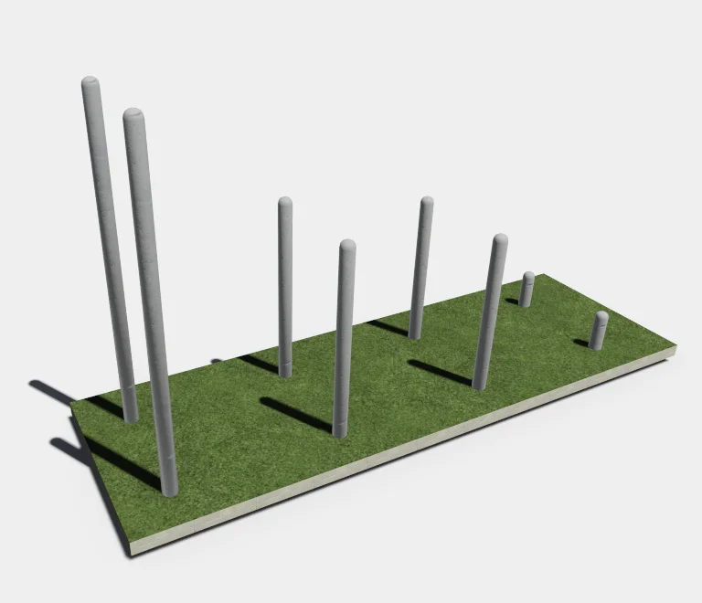 Опорные столбы высотой 2 шт. - 2300мм, 2 шт. – 1400мм, 2 шт. – 1100мм, 2 шт. – 300 мм от основания покрытия, диаметр которых предоставляется на выбор. Длина комплекса не более 3400 мм.