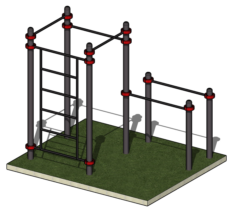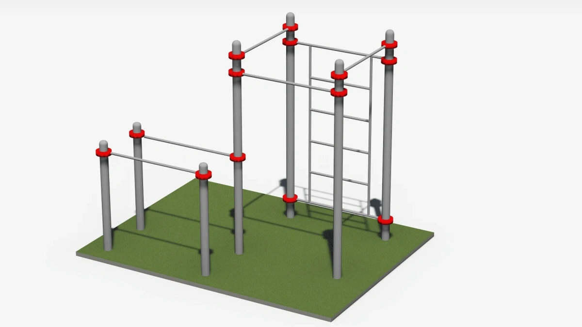 К опорным столбам высотой 2600мм крепятся с помощью хомутов на высоте от уровня основания: 2450 мм, 2350 мм, 2200 мм – перекладина туника шириной 1200 мм. Перекладины брусьев размером 1500 мм крепятся на высоте 1400 мм с помощью хомутов. Шведская стенка крепится к опорным столбам на высоте 2550 мм, размер шведской стенки 1200*2070 мм.