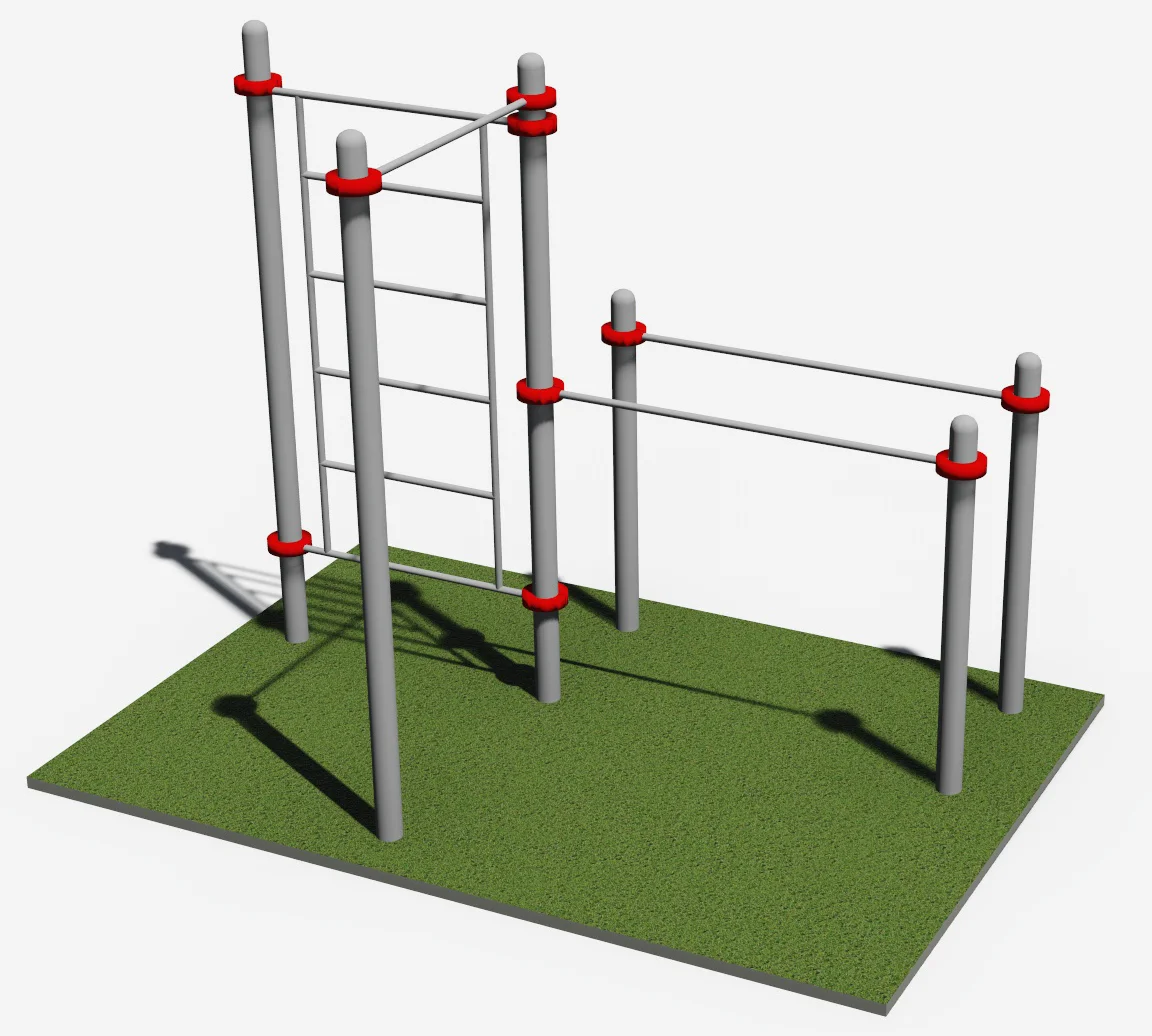 К опорным столбам высотой 2600мм в количестве 3 единиц крепится на высоте от уровня основания: 2450 мм – перекладина турника, 2300 мм- шведская стенка. Ширина шведской стенки составляет 1200 мм. Высота шведской стенки 2070 мм. Два столба высотой 1500 мм от уровня основания составляют опору для фиксации горизонтальных перекладин брусьев. Все составляющие комплекса крепятся между собой при помощи хомутов. Общая длина комплекса составляет не более 2950 м.