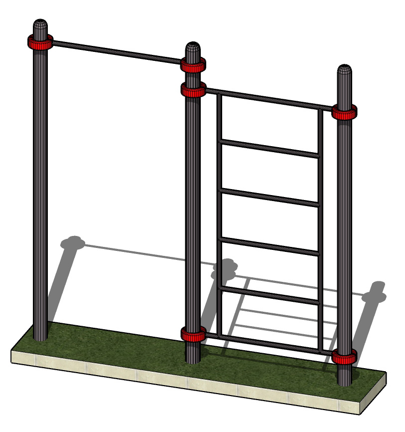 К опорным столбам высотой 2600мм крепятся с помощью хомутов на высоте от уровня основания: 2550 мм – перекладина туника шириной 1200 мм, 2400 мм –шведская стенка. Ширина шведской стенки 1200 мм. Шаг составляет – 34 см. Общая длина комплекса составляет не более 2700 мм.