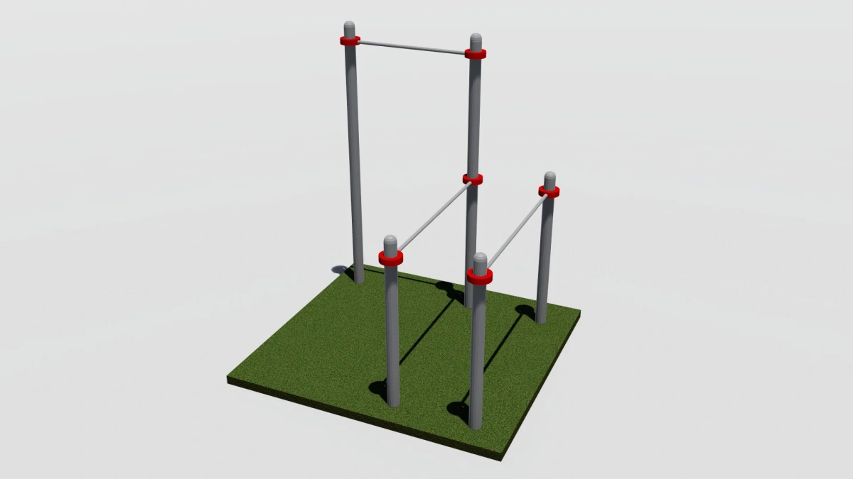 К опорным столбам высотой 2600мм в количестве 2 единиц крепится с помощью хомутов на высоте от уровня основания: 2550 мм – перекладина турника шириной 1200 мм, Брусья фиксируются на высоте 1400-1500 мм от уровня основания. Общая длина комплекса составляет не более 1900 мм.